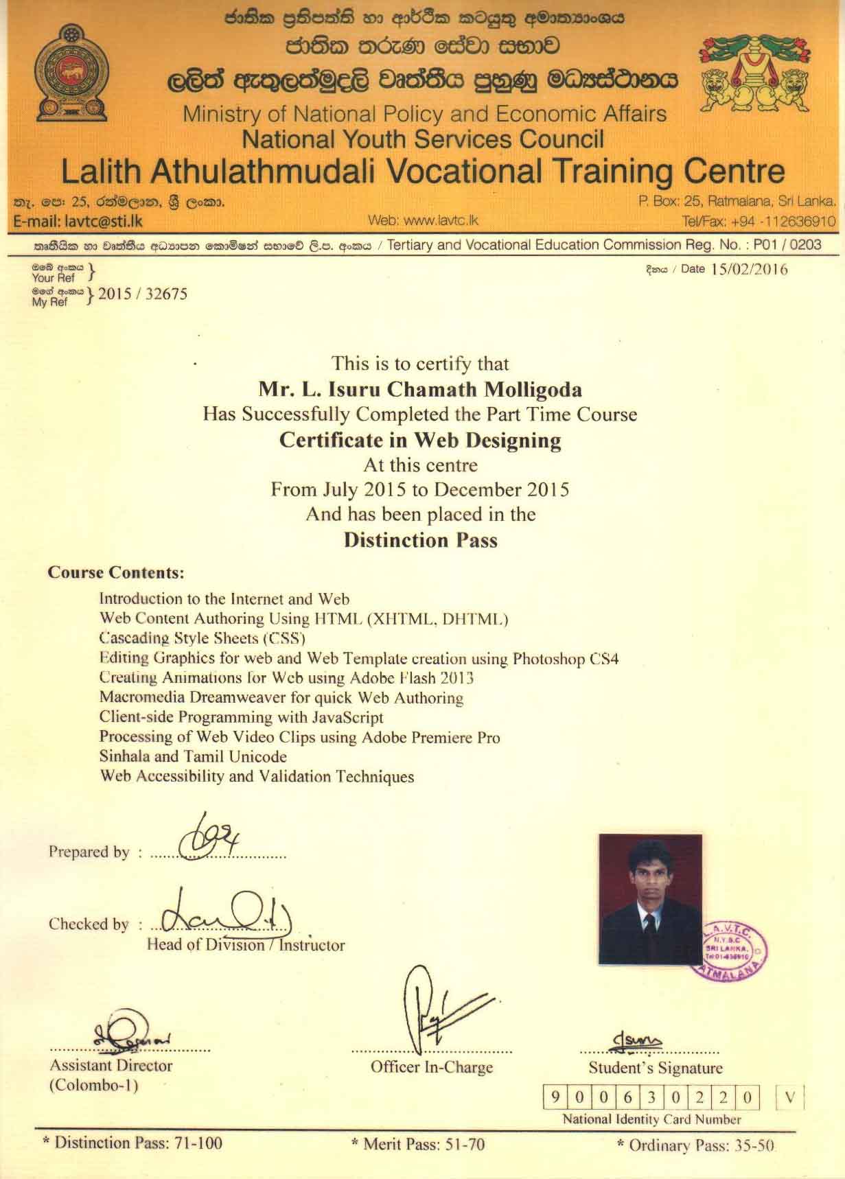 Completed the Certificate in Web Designing at Lalith Athulathmudali Vocational Training Center (LAVTC) in the 2015.